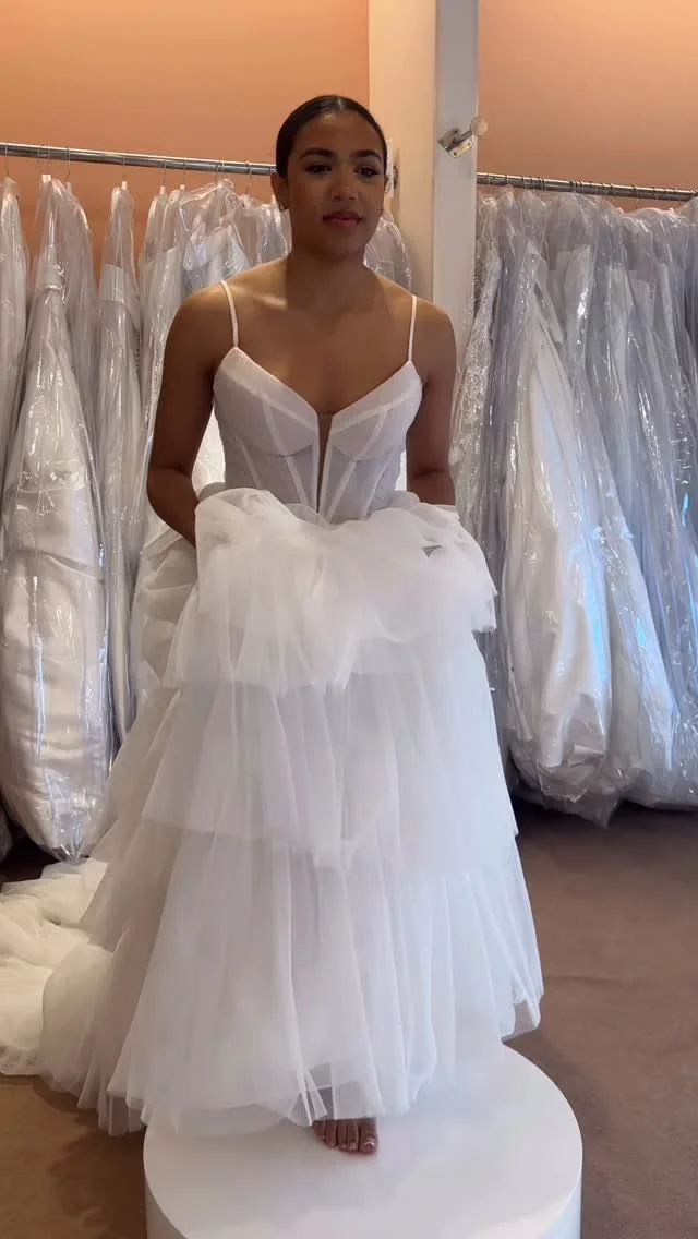 Crafted in rich brocade, this gown features a pointed scoop neckline and a flattering ruched bodice that cinches at the natural waist. The full skirt flows into a chapel-length train, adding classic volume and grace. A detachable over-the-shoulder shawl offers styling versatility—perfect for transitioning from ceremony to celebration with timeless sophistication.