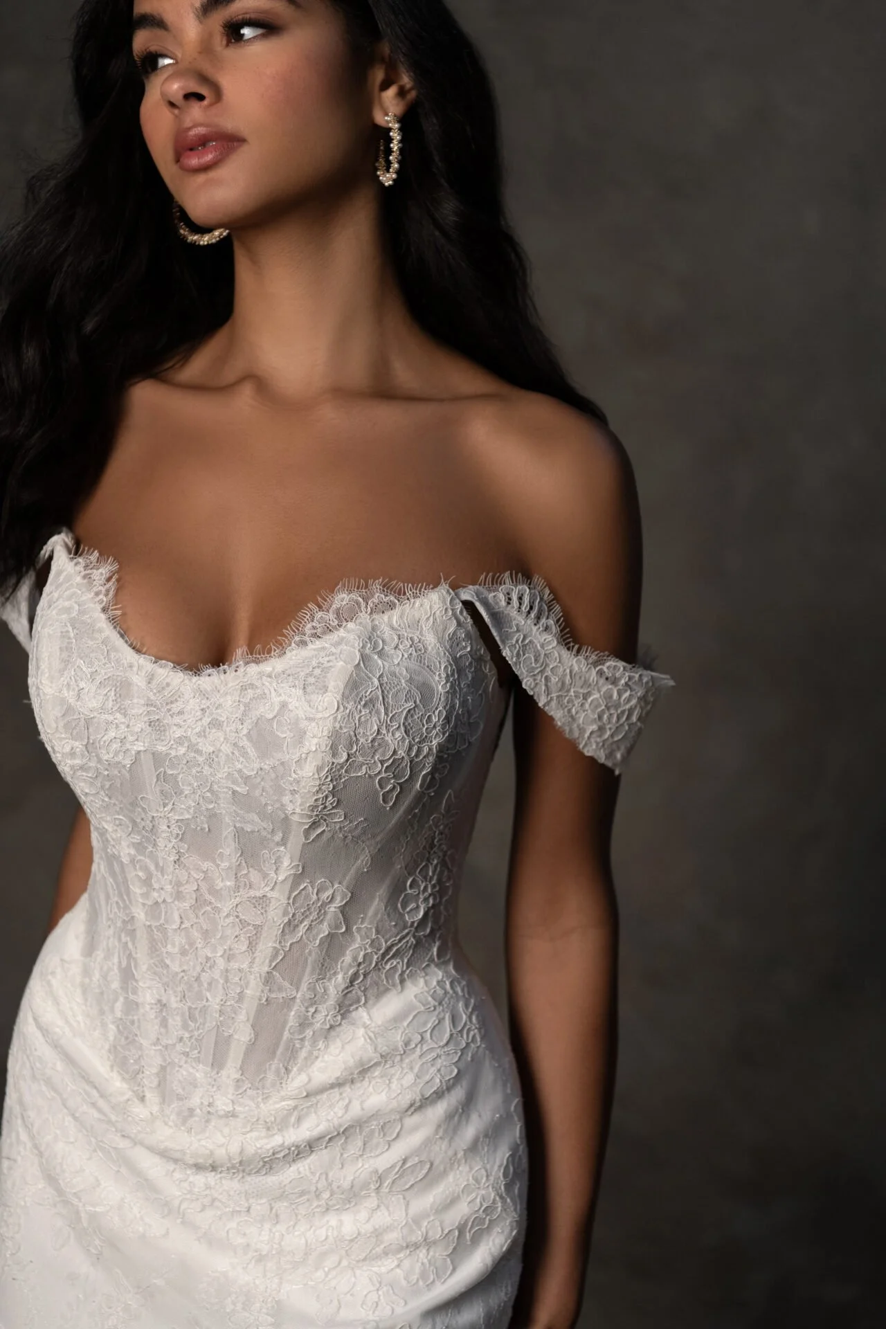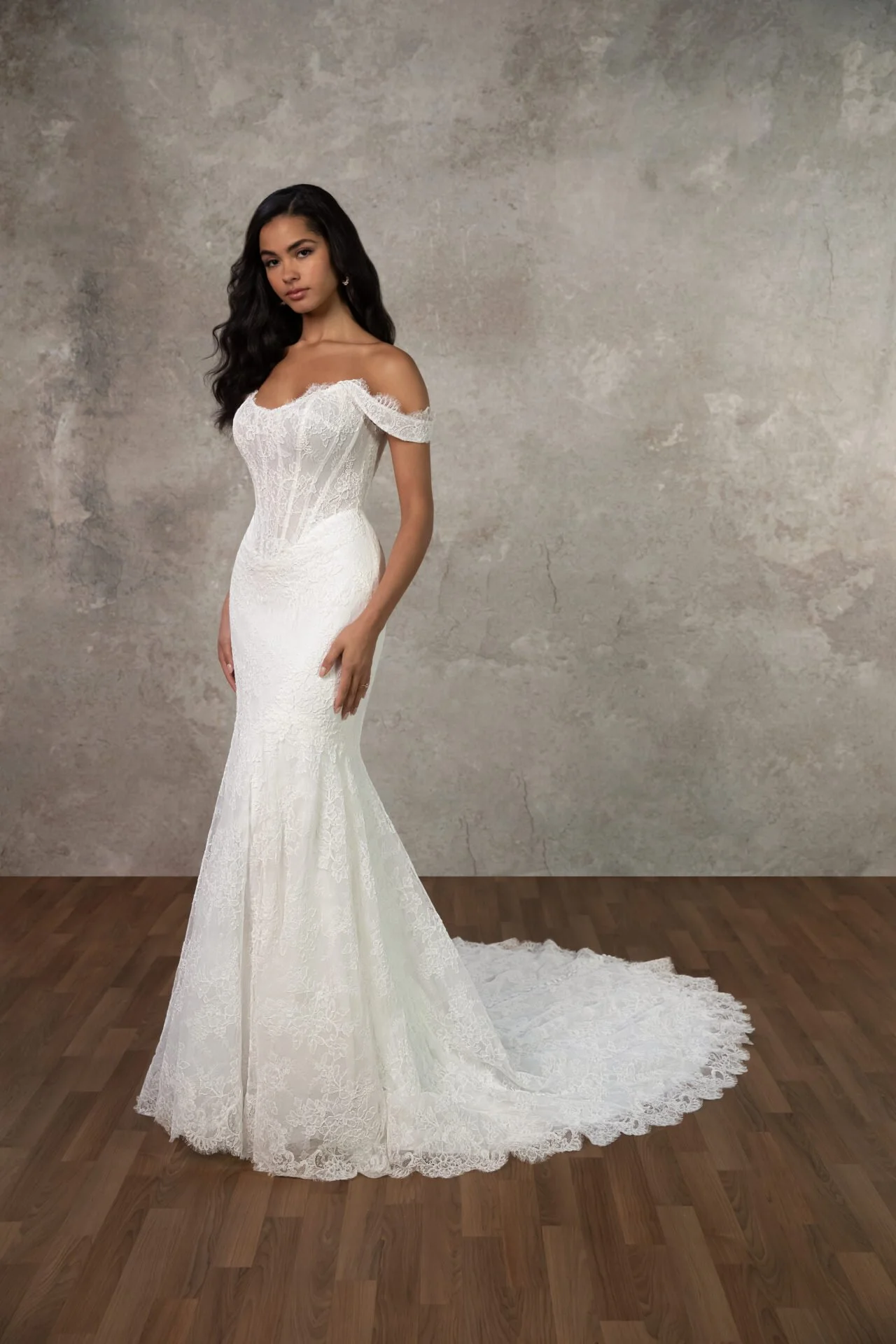 This wedding dress is timeless and sophisticated, perfect for a bride seeking a clean, elegant silhouette with just the right amount of embellishment for visual interest. It is adorned with delicate floral appliqué embroidery that cascades down one side of the bodice and lightly trails onto the hips and upper skirt area. These appliqués add texture and a subtle romantic touch.